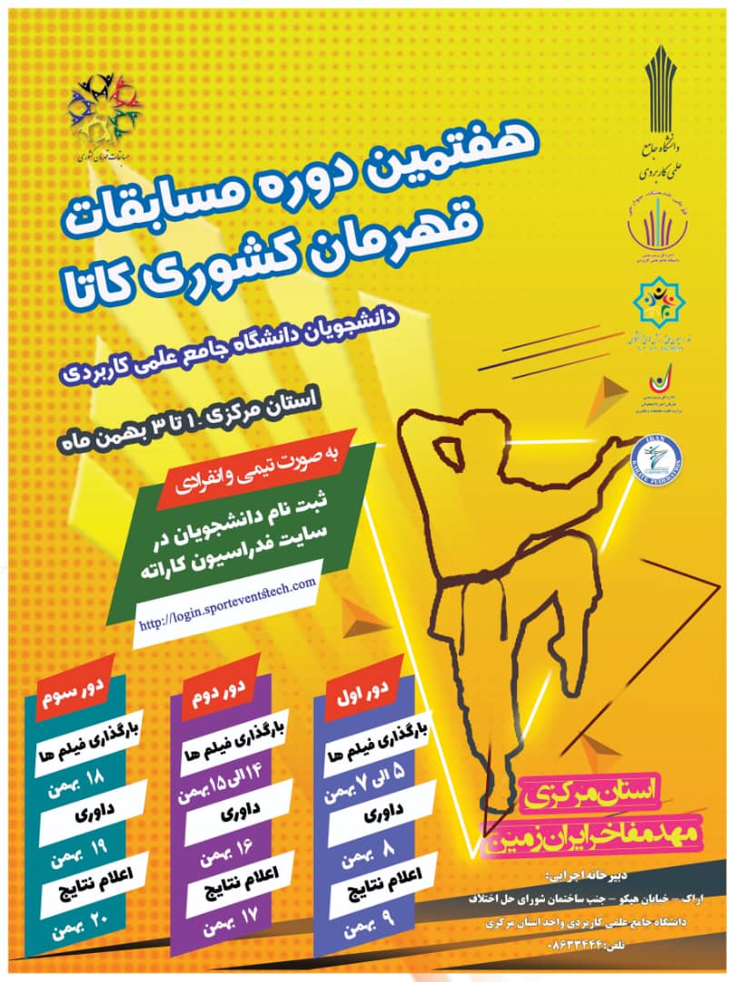 به نقل از روابط عمومی دانشگاه جامع علمی کاربردی واحد استانی مرکزی، بر اساس اعلام دبیرخانه اجرایی هفتمین دوره مسابقات قهرمان کشوری دانشجویان دانشگاه جامع علمی کاربردی در رشته کاتا به میزبانی این واحد استانی، به منظور جذب بیشتر دانشجویان ورزشکار و ایجاد فرصت برای آن دسته از دانشجویان علاقمند به فعالیتهای ورزشی که موفق به ثبت نام در این رویداد ورزشی نشده اند، با توجه به اخذ مجوز از فدراسیون کاراته کشور و بر اساس تصمیم کمیته اجرایی برگزاری مسابقات، مهلت ثبت نام تمدید شد.