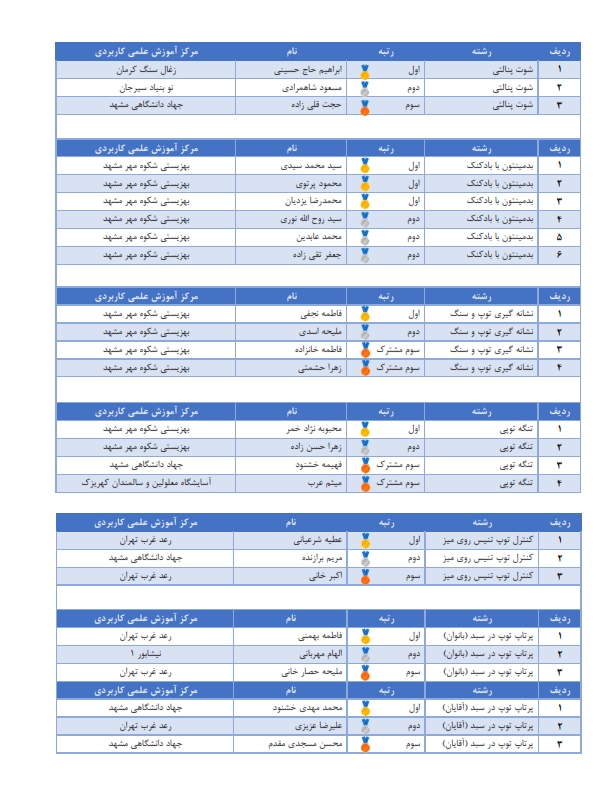 همچنین رئیس واحد استانی خراسان رضوی ضمن خوشامد گویی، با ارائه گزارشی از شروع این پارالمپیاد افزود: این دوره از مسابقات از یکم بهمن ماه آغاز و تا 25 بهمن ماه سالجاری در طی کمتر از یکماه ادامه داشت که در این مدت بیش از 100 کلیپ و فایل تصویری از مسابقات دانشجویان بصورت مجازی برای دبیرخانه اولین پارالمپیاد دانشجویی که امسال برعهده واحد استانی خراسان رضوی بود ارسال شد و داوران از 25 تا 30 بهمن ماه سالجاری با بررسی دقیق، مسابقات را داوری کردند و در نهایت برگزیدگان این دوره از مسابقات به شرح زیر انتخاب و معرفی شد: