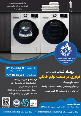 لازم به ذکر است اولین رویداد شتاب، نوآوری در صنعت لوازم خانگی در دانشگاه جامع علمی کاربردی استان اصفهان روز پنج شنبه بصورت مجازی به آدرس Eve.ientekhabgroup.com/startup برگزار میشود.
