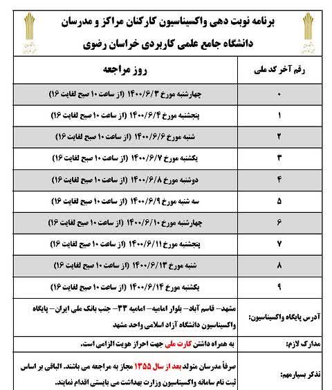 همچنین با توجه به محدودیت های موجود، واکسیناسیون همه مشمولین در سطح استان خراسان رضوی صرفا در مشهد و در آدرس اعلام شده به کارکنان و مدرسان انجام می پذیرد لذا مدرسان و کارکنان از حضور درسایر مراکز واکسیناسیون خودداری کنند.