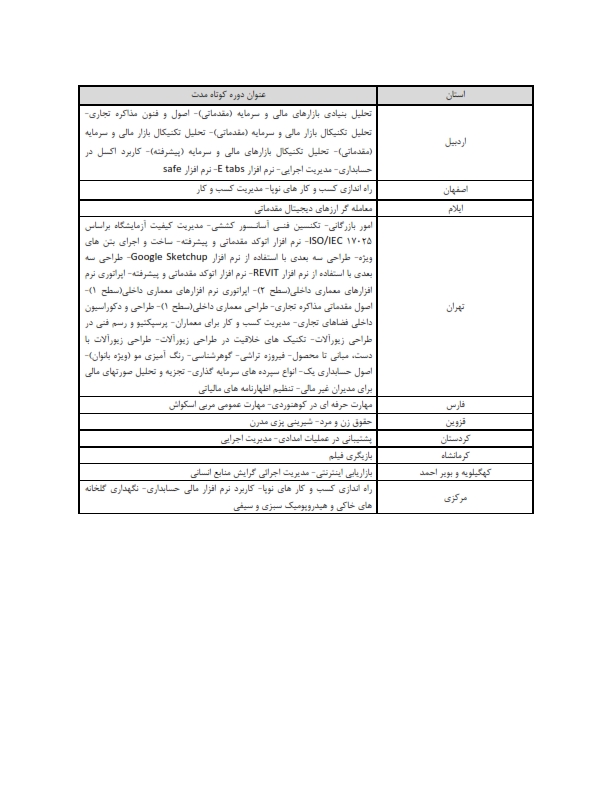 فهرست مجوزهای صادرشده دورههای کوتاه مدت علمی کاربردی به شرح جدول زیر میباشد، که متعاقباً با صدور موافقتنامه رسمی به هر واحد استانی دانشگاه جامع علمی کاربردی ابلاغ می شود. علاقمندان جهت کسب اطلاع بیشتر از کم و کیف مشخصات دورههای مذکور میتوانند با واحد استانی مربوطه تماس حاصل نمایند.