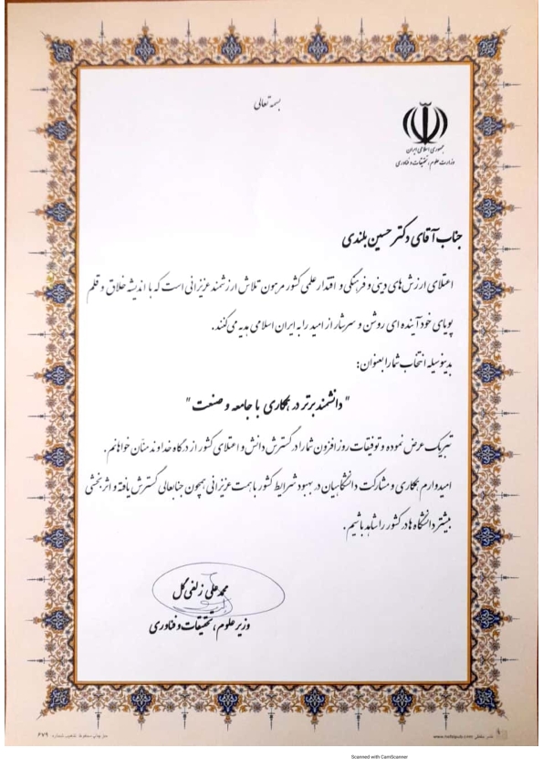 بدینوسیله انتخاب شما را بعنوان دانشمند برتر در همکاری با جامعه و صنعت تبریک عرض نموده، توفیقات روز افزون شما را در گسترش دانش و اعتلای کشور از درگاه خداوند منان خواهانم. امیدوارم همکاری و مشارکت دانشگاهیان و بهبود شرایط کشور با همت عزیزانی همچون جنابعالی گسترش یافته و اثر بخشی بیشتر دانشگاه ها در کشور را شاهد باشیم.