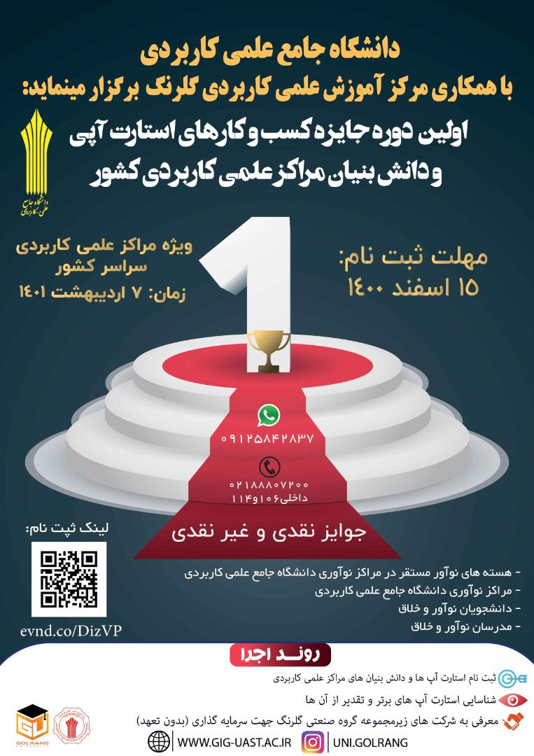 به گزارش روابط عمومی دانشگاه جامع علمی کاربردی، اولین دوره جایزه کسب و کارهای استارت آپی و دانشبنیان مراکز آموزش علمی کاربردی سراسر کشور با همکاری مرکز آموزش علمی کاربردی گروه صنعتی گلرنگ برگزار می شود.