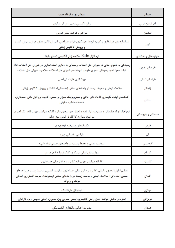 گفتنی است علاقهمندان میتوانند جهت کسب اطلاعات بیشتر از مشخصات دورههای یاد شده با واحدهای استانی مربوطه تماس گرفته و یا از طریق سامانه ساتب به آدرس https://sateb.uast.ac.ir از آخرین وضعیت دورههای کوتاه مدت علمی کاربردی در زمان ثبت نام مطلع شوند.