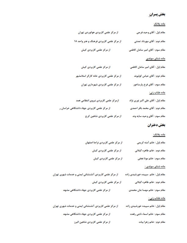 در مجموع تعداد 163 نفر دانشجو از 19 استان در ماده های مختلف حضور داشتند که نتایج مسابقات به شرح زیر اعلام شد: