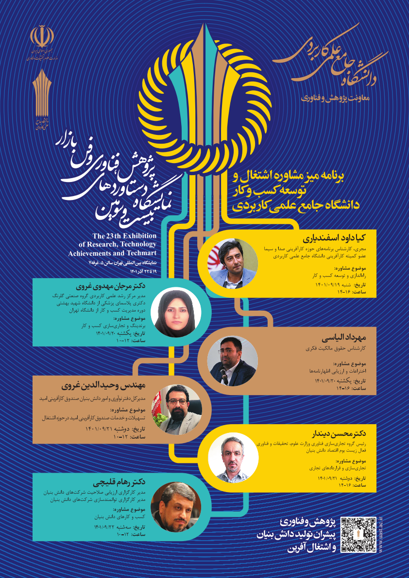 برنامه های میز مشاوره شغلی و توسعه کسب و کار دانشگاه جامع علمی کاربردی در بیست و سومین نمایشگاه دستاوردهای پژوهش، فناوری و فن بازار سال 1401اعلام شد.